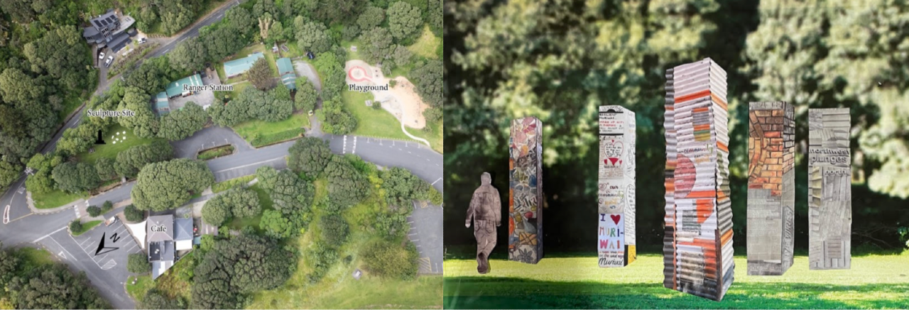 'The sculpture is a series of eight free-standing columns, or Pou. People can walk through and around the sculpture. One piece is low to the ground, for people to use as seating. Viewers can walk between and around the uprights, and touch and photograph them. Given the scale of the space, the tallest column would stand between 3.5 metres tall and remain outside the drip line and beneath the height of the surrounding trees.
